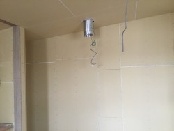 プラスターボードまたは石膏ボードとよばれる板状のボードを壁前面に貼り付けていきます。