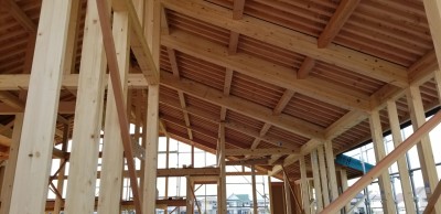 本日は曇り空の中、屋根部構造用合板貼りの施工をスタートしました!!