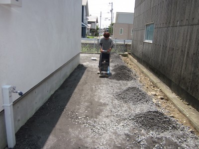 重いコンクリートが自重で沈まないように基礎部分の下地として砕石を押し固めます。